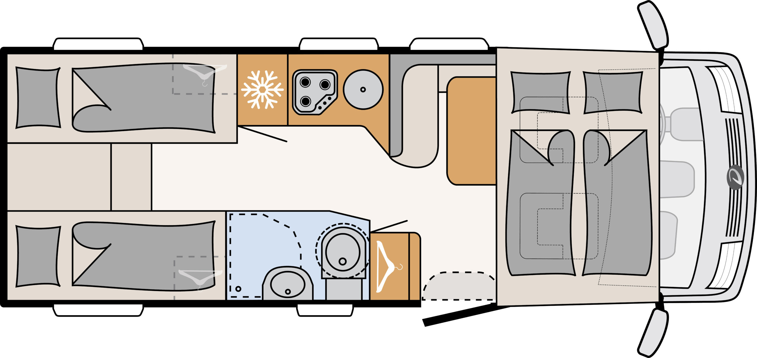 | Let op | Bij McRent huurt u een camper in de categorie Comfort Luxury. Een specifieke indeling is niet gegarandeerd. |