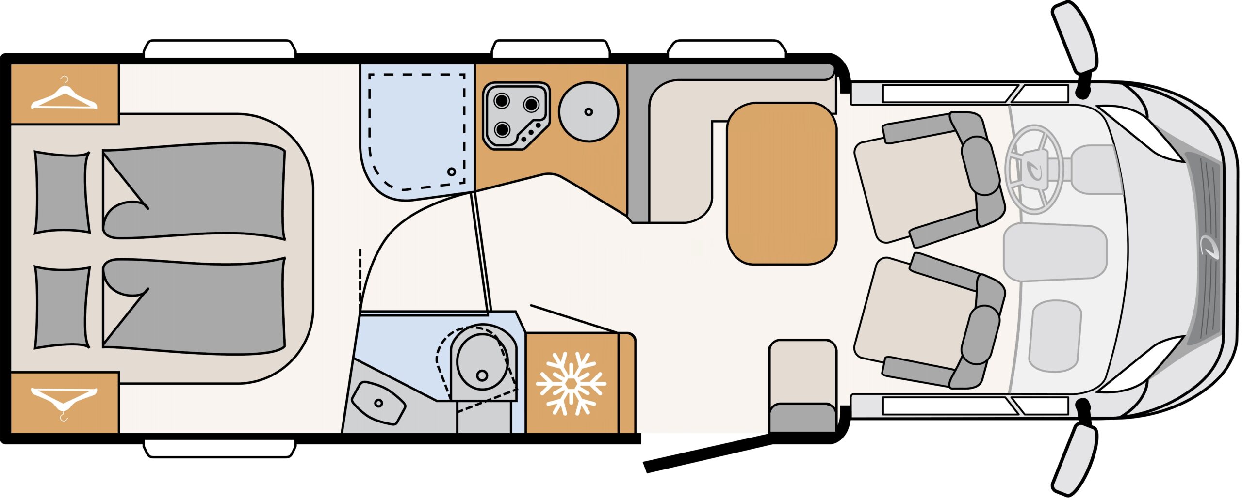 | Let op | Bij McRent huurt u een camper in de categorie Comfort Standard. Een specifieke indeling is niet gegarandeerd. |