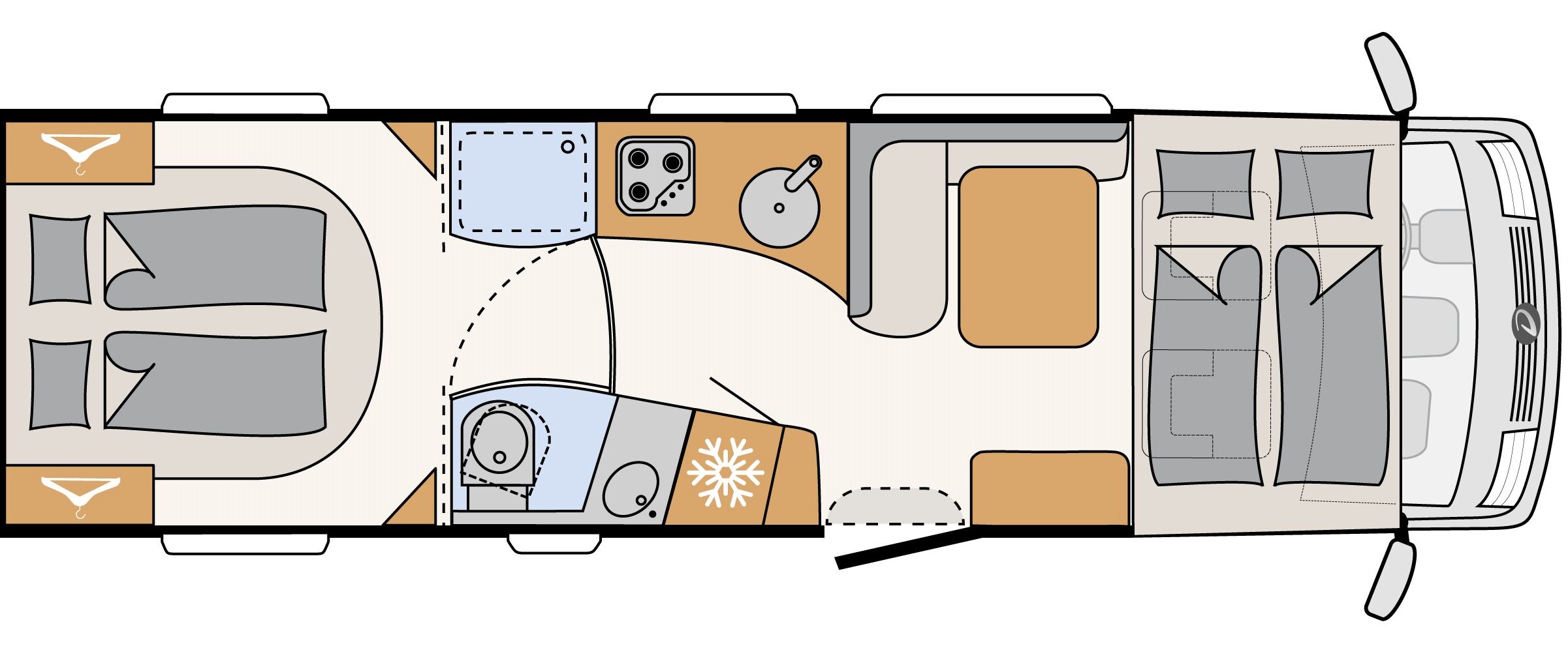 Deze gegevens zijn een indicatie van het voertuig. De (bed-)afmetingen kunnen afwijken van de hiernaast genoemde maten. Dit is afhankelijk van het bouwjaar en de beschikbaarheid. Wanneer blijkt dat de verhuurder wegens onvoorziene omstandigheden het gereserveerde campertype niet kan leveren, behoudt hij het recht voor deze te vervangen voor een vergelijkbaar of groter campertype. Eventuele extra kosten die hieruit voortvloeien, voor bijvoorbeeld brandstofverbruik, campingplaatsen, ferry overtocht e.d. komen niet in aanmerking voor restitutie en worden niet vergoed door de verhuurder en/of Campers Europa.