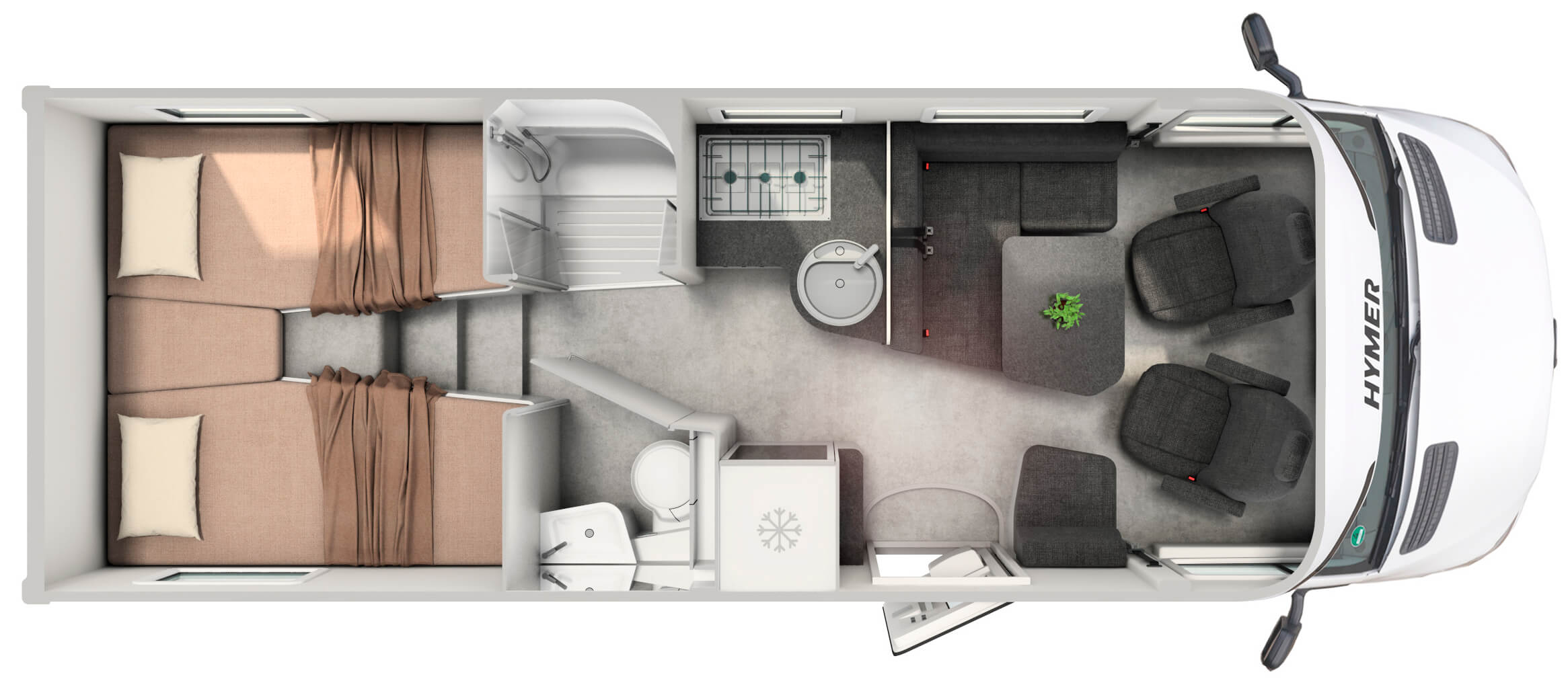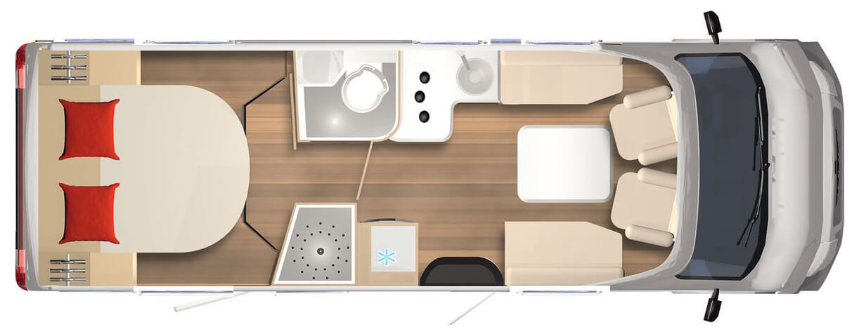 | Bed voorin hefbed | 1,88 m x 1,05 m – 1,30 m (lengte x breedte) |